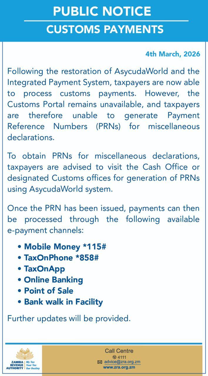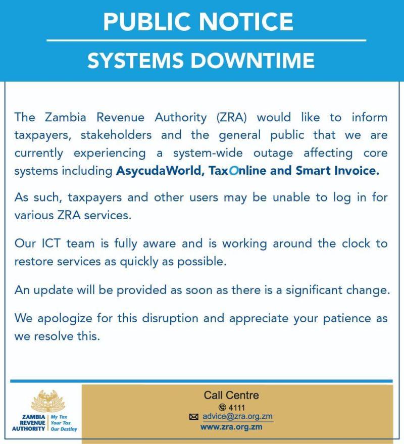 Zambia Revenue Authority System Downtime (Updated 5th March)